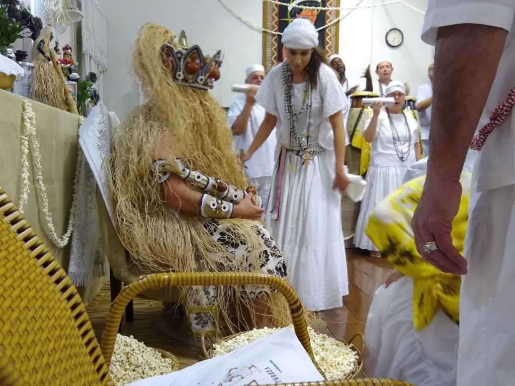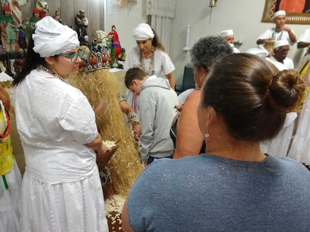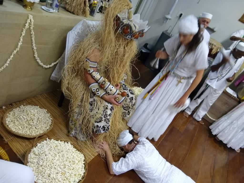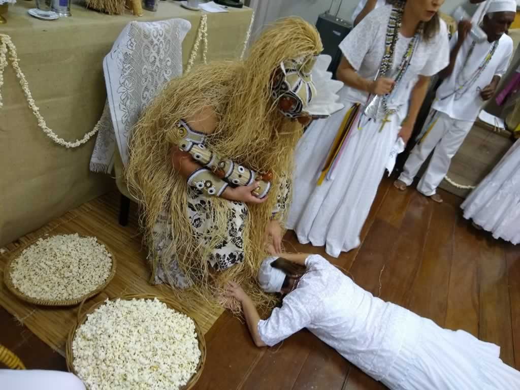 Ele abençoou todos os presentes com o ritualistico banho de pipocas, para depois o atendimento ser realizado pelos queridos preto- velhos.